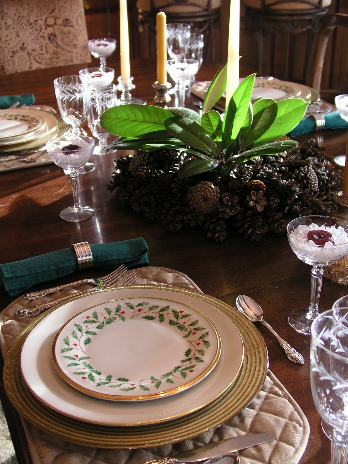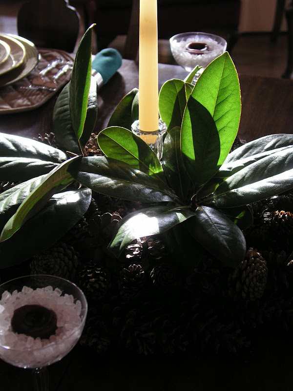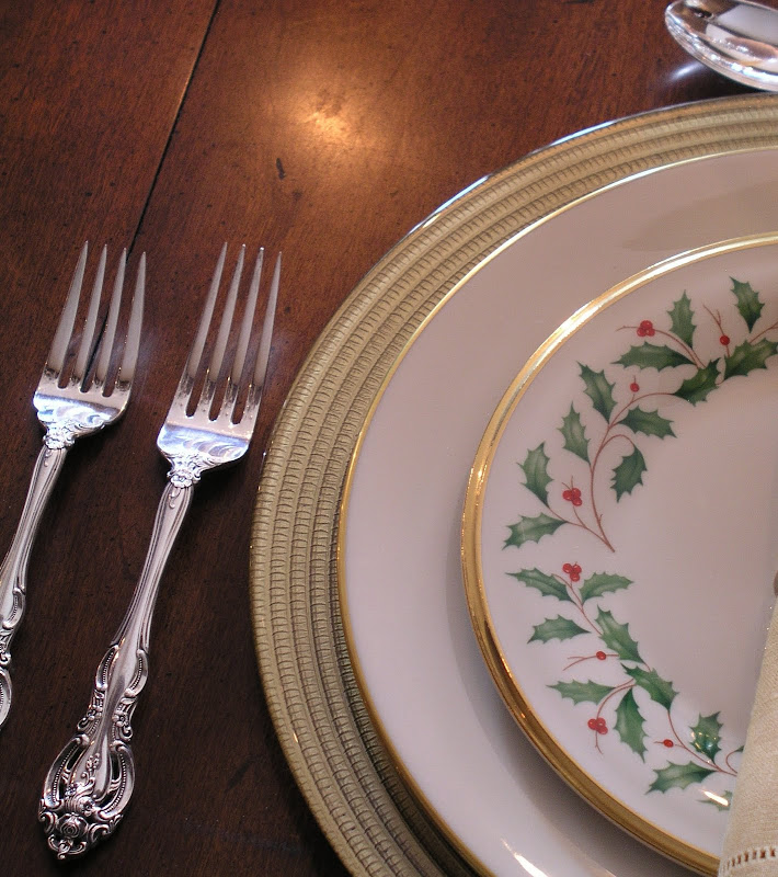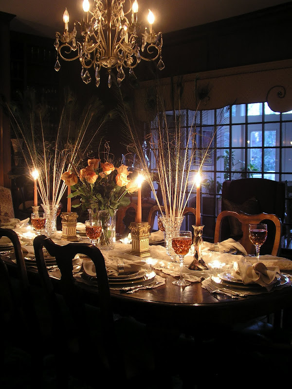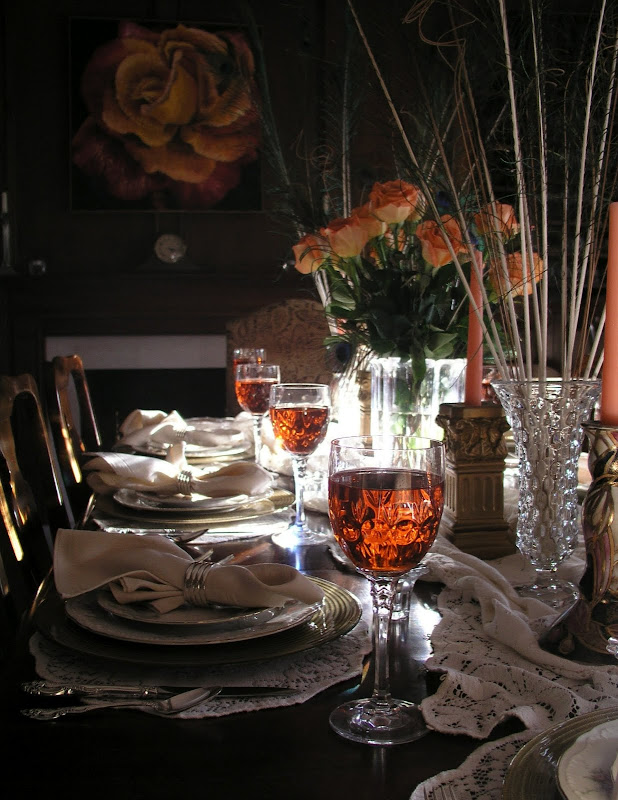 There are flowers on the vintage Theodore Haviland china, a recent local estate sale find (reduced on the final day of the sale to only $50 for eight place settings, including cups and saucers, creamer & sugar, platter, and vegetable bowl). The gold-colored glass chargers (a Goodwill purchase) visually separate the china from the cotton lace placemats and add "weight" to offset the tall centerpiece.