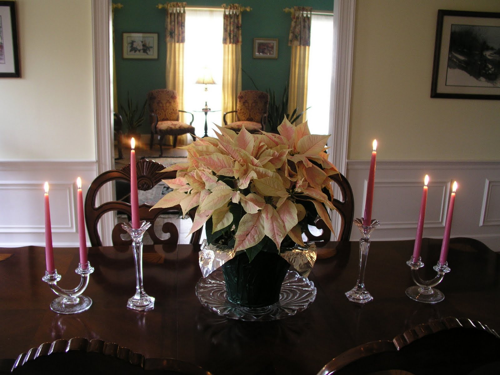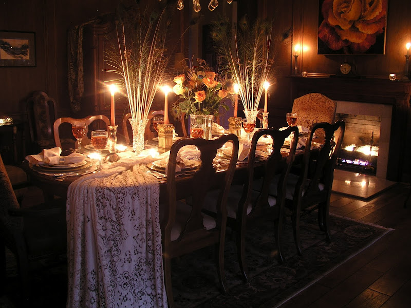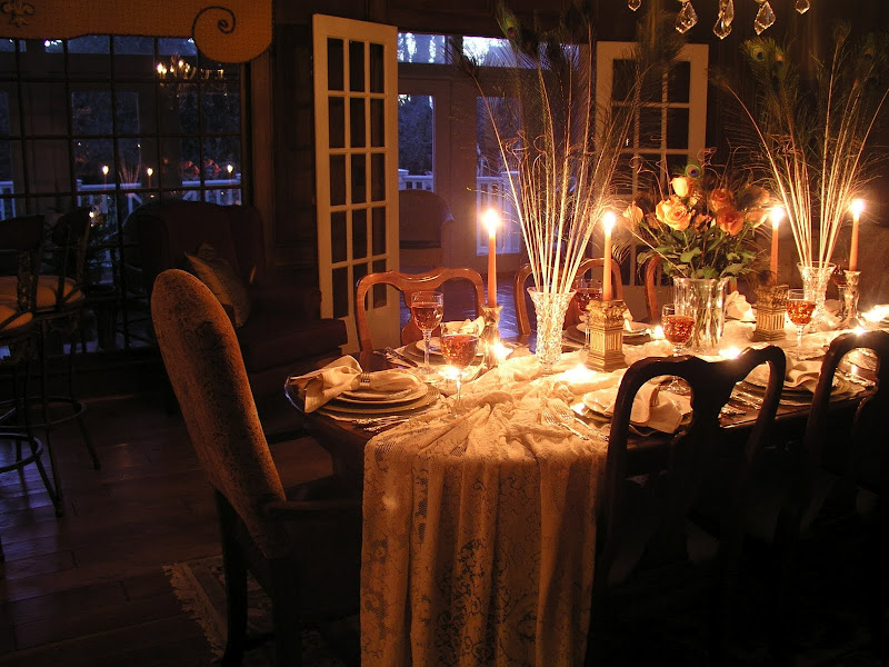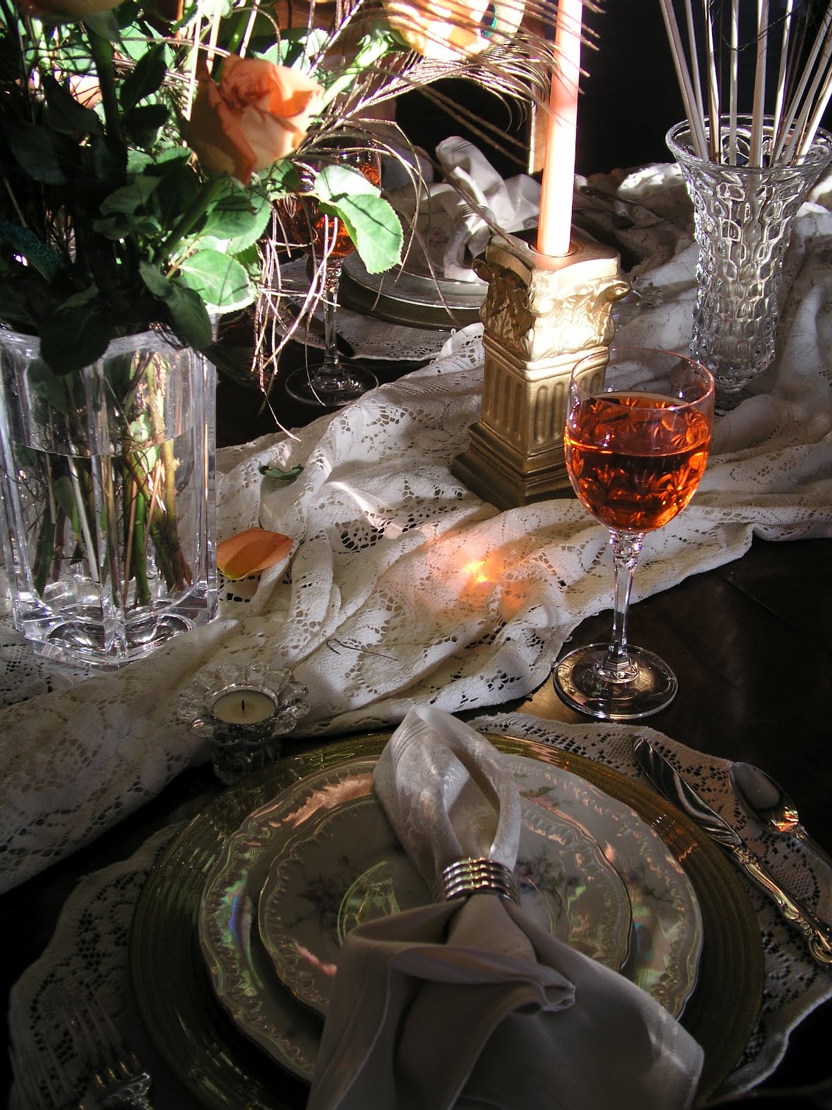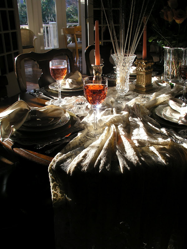 Rather than covering the table with a cloth, I decided it might be more interesting to drape a soft, cotton lace tablecloth down the center of the table as a runner. I ended up using three vintage Quaker Lace cloths, letting them "flow" down the center of the table, spilling off the ends of opposite diagonal corners.