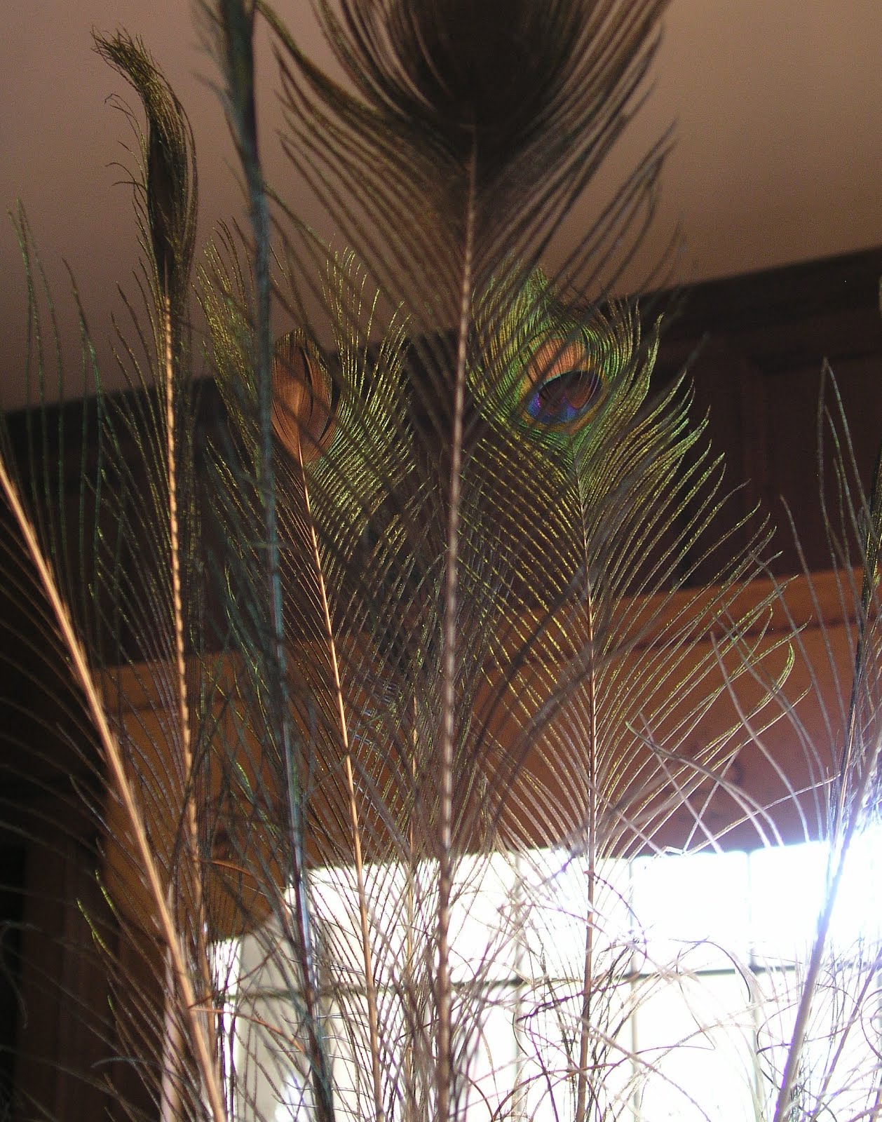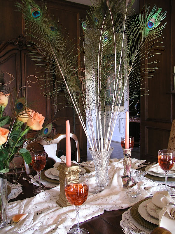 So far, I've mentioned flowers and lace. Peacock feathers could be seen as another romantic symbol, at least for peafowl! The males display their colorful, iridescent "trains," during courtship rituals, lifting and fanning them out in an attempt to attract a harem. I found these in the floral department of a local Kroger supermarket (only $8.99 per dozen, and I can re-use them for future projects).
