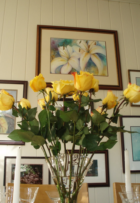 I needed a centerpiece FAST ... I was trying to get pictures taken before I lost the light. I ran in the supermarket on the way home from work and selected these roses from a group that had been reduced to $2.99. I didn't even re-cut the stems ...just put them in water and let the vase "arrange" them.